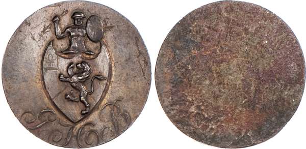 Birmingham, George Barker another early obverse die trial as last but with the initials GHB now in and the scratched in lance now changed to an arrow, also the fleur de lis in arms now scratched in, 30mm/10.19gm. (cf DH 65), good Extremely Fine trace of lustre, toned. Unique.