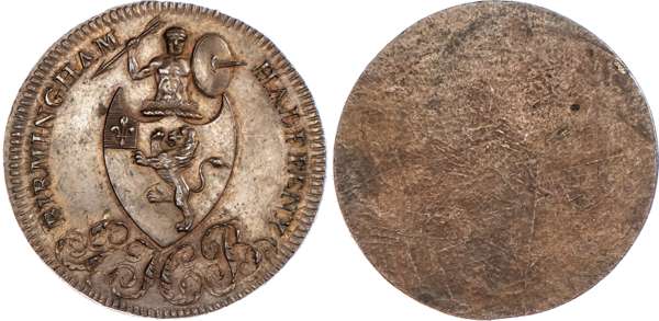 Birmingham, George Barker, uniface die trial for the not quite competed obverse (1797) – Barker arms (but no hatching in shield) and crest, GHB below, rev. blank, edge plain, 32.25mm/13.76gm. (DH 65), good Extremely Fine, nicely toned – dusky with just a trace of lustre. Extremely rare, very lightly this is one of two specimens known.
