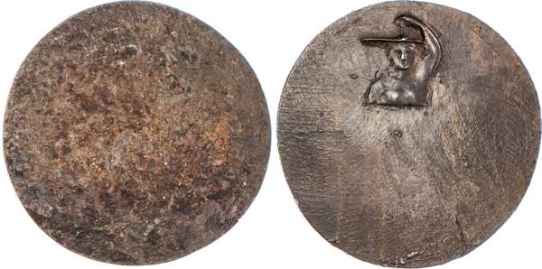 Birmingham, George Barker uniface and early stages die trial of the reverse - of his second Halfpenny (1797), Upper body of Justice holding scales, rev. blank, edge plain, 30.5mm/8.81gm. (DH cf 66), good Extremely fine for issue, toned. Unique.