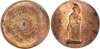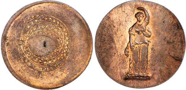 Birmingham, George Barker uniface and early stages die trial of the reverse - of his second Halfpenny (1797), now showing whole body of Justice holding no scales, rev. blank but punched three times with laurel wreath within with ‘GILT’ at top, edge plain, 30.5mm/11.73gm. (DH cf 66), good Extremely with almost full original mint lustre. Unique.