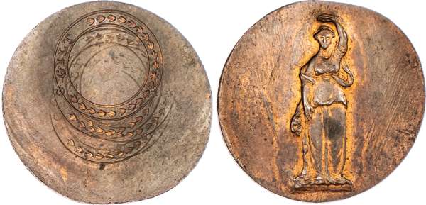Birmingham, George Barker uniface and early stages die trial of the reverse - of his second Halfpenny (1797), same as above - whole body of Justice holding no scales, rev. blank with three punched rings, edge plain, 30.5mm/11.52gm. (DH cf 66), good Extremely Fine with not quite as much lustre as previous. Unique.