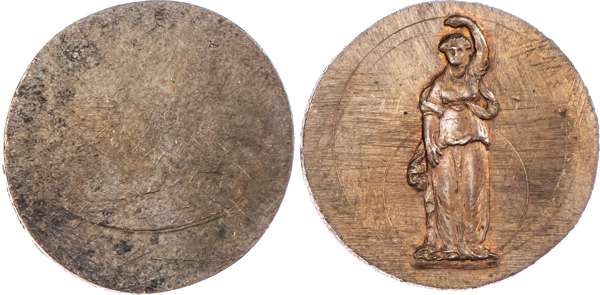 Birmingham, George Barker uniface and early stages die trial of the reverse - of his second Halfpenny (1797), same as above - whole body of Justice holding no scales but legend guidelines scratched in, rev. blank, edge plain, 30mm/14.01gm. (DH cf 66), good Extremely Fine, trace of lustre, file marks in field. Unique.