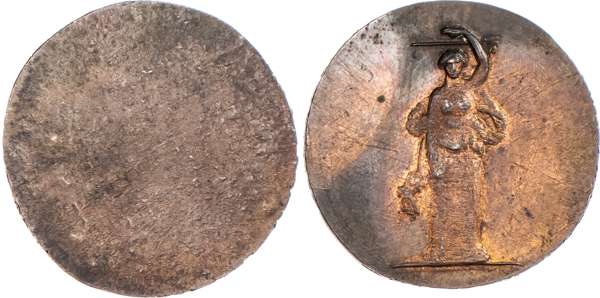 Birmingham, George Barker uniface and early stages die trial of the reverse - of his second Halfpenny (1797), as above, showing whole body of Justice now holding scales, rev. blank with no punched rings, edge PAYABLE AT THE HOUSE OF JOHN CLARKE HULL STREET, 32mm/11.96. (DH cf 66), good Extremely Fine with much lustre, blank side toned, Justice lacking detail. Unique.