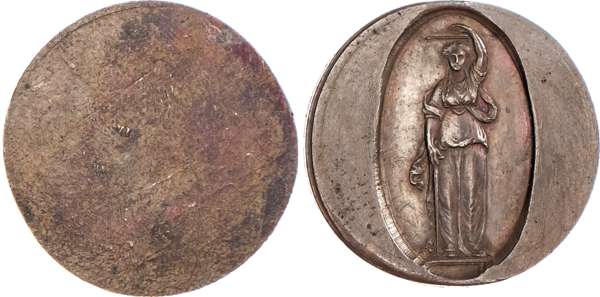 Birmingham, George Barker uniface and early stages die trial of the reverse - of his second Halfpenny (1797), as above, showing whole body of Justice holding scales but now sunk in an incuse oval, rev. blank, edge plain, 31.5mm/13.57. (DH 66), good Extremely Fine with much lustre, blank side toned, Justice lacking detail. Unique.