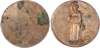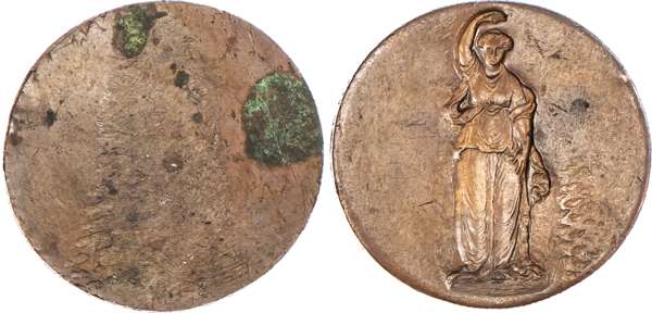 Birmingham, George Barker uniface and early stages die trial of the reverse in incuse - of his second Halfpenny (1797), as above, showing whole body of Justice holding scales,rev. blank, edge plain, 29.5mm/13.67. (DH cf 66), about Extremely Fine, strange ‘tyre marks’ each side, two spots of verdigris on blank side. Unique.