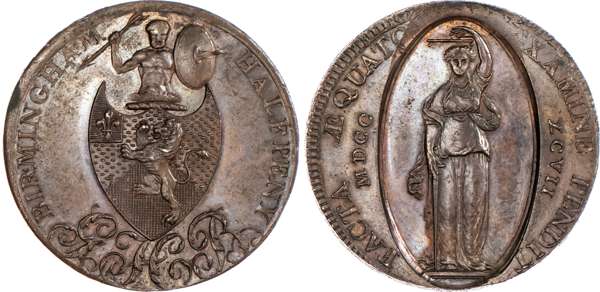 Birmingham, George Barker Halfpenny 1797, Crest and arms of the Baker family, rev. Justice standing within an incuse oval, edge very faintly, PAYABLE ON DEMAND, 30mm/13.80gm. (DH 67), as struck, darkly toned with superb iridescence, one small verdigris spot on edge (obv 10 o’ clock). Of the highest rarity ‘RRR’, reportedly only three in existence.