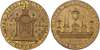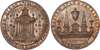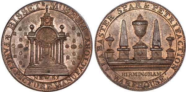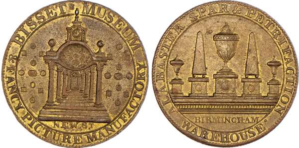 Birmingham, James Bisset (proprietor of museum and marble warehouse) halfpenny undated, view through a colonnade with miniature pictures either side, rev. stone monuments – pyramids and urns, edge plain, 29.5mm/10.14gm. (DH 120), Another the same but in brass, 29.5mm/10.36gm. (DH 120), both good Extremely Fine, first prettily toned with much original lustre, second a more matt. yellow toning with traces of original brilliance in protected areas of field, this off‑metal extremely rare ‘RRR’[2].