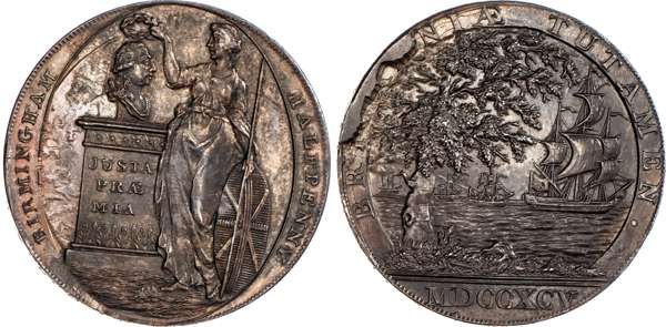 Birmingham, John Clarke (chemist, grocer and coin collector) private halfpenny 1795, another but with die break on rev, edge evident, 29.5mm/13.05)gm. (DH 122), good Extremely Fine with beautiful and dark toning with a trace of lustre, cud on rev, edge which is the beginning of the die breaking which terminated the issue. Very rare (reportedly only 36 struck).