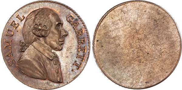 Birmingham, Samuel Garbett) Uniface private Medalet/Halfpenny by John Hancock, Another the same but edge plain, 29mm/10.73gm. (DH 125a), about as struck with reflective fields with more than a trace of lustre, superb and unpublished with this edge ‘RRRR’.