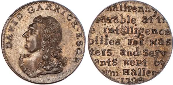 Birmingham, William Hallan, Skidmore’s mule Halfpenny 1792, Draped bust of David Garrick left, rev. 8-line legend. re locating servants, edge plain, 30.75mm/11.62gm. (DH 139a). Another the same but on a very small flan and edge rounded, 28mm/8.01gm. (DH 139a), both good Extremely Fine, toned with traces of mint lustre. Flan is so small on second that 8‑line legend does not fit – on first, rev. die is broken at edge so cud showing. Both extremely rare ‘RRR’. [2]