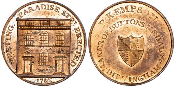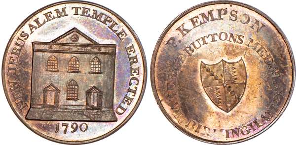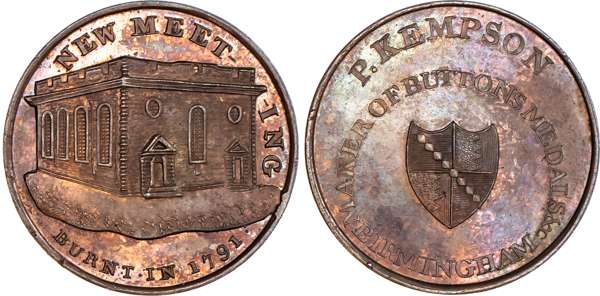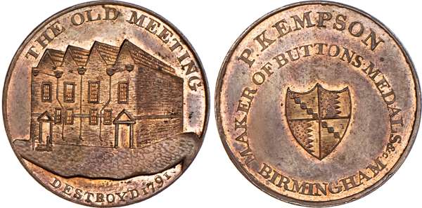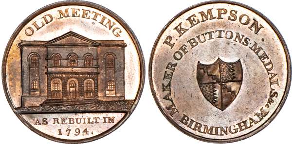 Birmingham, P Kempson’s Series of Birmingham Buildings, Halfpenny undated, View of the Old Meeting House, rev. Arms of Birmingham in circular legend, edge plain, 29mm/14.35gm. (DH 159). Another similar but rev. has period in legend, 29mm/14.17gm. (DH 160). Another but obv. the new Old Meeting House, 29mm/12.57gm. (DH 162). Another but obv. the New Meeting House, 29mm/10.93gm. (DH 164). Another similar but rev. has period in legend, 29mm/12.73gm. (DH 165). Another but obv. the Meeting House in Paradise St., 29mm/11.79gm. (DH 167). Another but obv. the New Jerusalem Temple, 11.91gm. 12. (DH 169), all good Extremely Fine and all with substantial amounts of original mint lustre. [7]