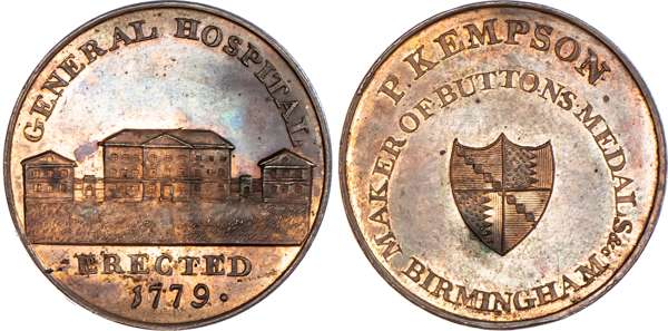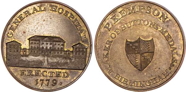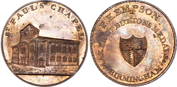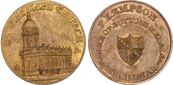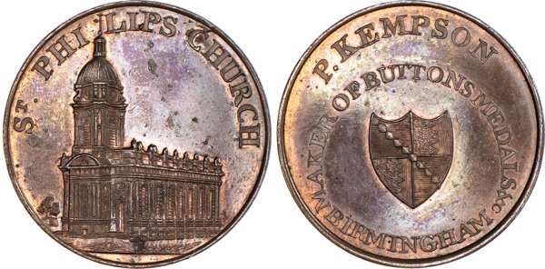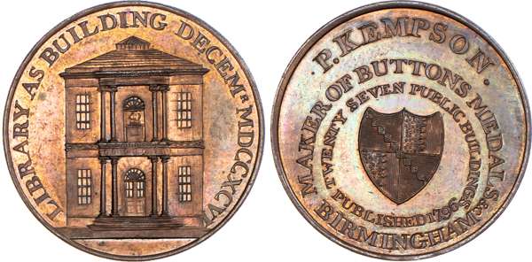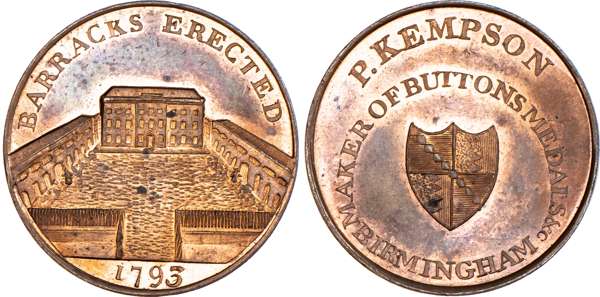 Birmingham, P Kempson’s Series of Birmingham Buildings, Halfpenny undated, View of the St. Paul’s chapel, rev. Arms of Birmingham in circular legend, edge plain, 29mm/12.46gm. (DH 172). Another but obv. St. Philip’s Church, 29mm/11.47gm. (DH 174). Another similar with period on rev. and in brass, 29mm/12.42gm. (DH 175). Another but obv. the Barracks, 29mm/11.57gm. (DH 177). Another but obv. General hospital, 29mm/11.63gm. (DH 181). Another the same but in brass, 29mm/11.97gm. (DH 181). Another dated 1796 but obv. the Library, 29mm/11.72gm. (DH 184a), first brass piece Extremely Fine and yellow toned, second brass good Extremely Fine with remains of original colour. Rest good Extremely Fine with considerable amounts of reflection and original mint lustre, especially DH 172 and 177 which are blazing full lustre. [7]