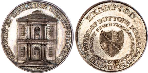 Birmingham, P Kempson’s Series of Birmingham Buildings, Silver Halfpenny 1796, View of the Library as being built 1795, rev. Arms of Birmingham in circular legend, edge plain, 29mm/11.73gm. (DH 184a), good Extremely Fine, nicely and evenly toned with much reflection and steel grey iridescence. Extremely rare ‘RRR’