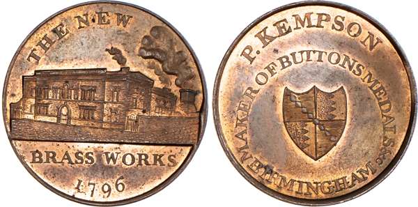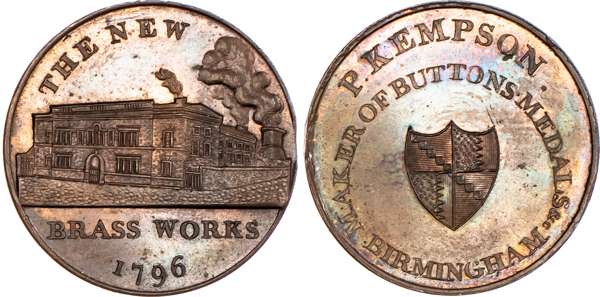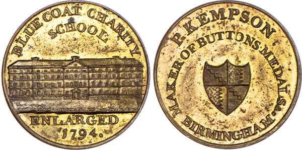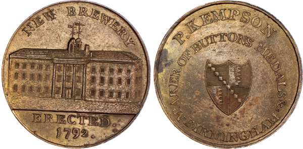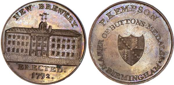 Birmingham, P Kempson’s Series of Birmingham Buildings, Halfpenny undated in brass, View of the Blue Coat Charity School, rev. Arms of Birmingham in circular legend, edge plain, 29mm/12.62gm. (DH 197a). Another, copper, but obv. the Free School, 29mm/13.46gm. (DH 200). Another but obv. the New Brass Works, 29mm/11.23gm. (DH 202). Another similar with period on rev. 29mm/13.9gm. (DH 203). Another but obv. the New Brewery, 29mm/11.64gm. (DH 205). Another the same but in brass, 29mm/11.76gm. (DH 205), Another copper, similar but rev. spacing different, 29mm/11.94gm. (DH 206), all good Extremely Fine with much reflection, two brass pieces particularly so with golden lustre, second a little more matt – others all with degrees of lustre – first two particularly so. Two off‑metal pieces extremely rare ‘RRR’. [7]