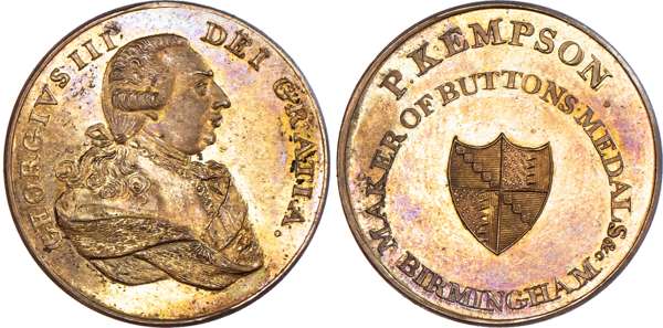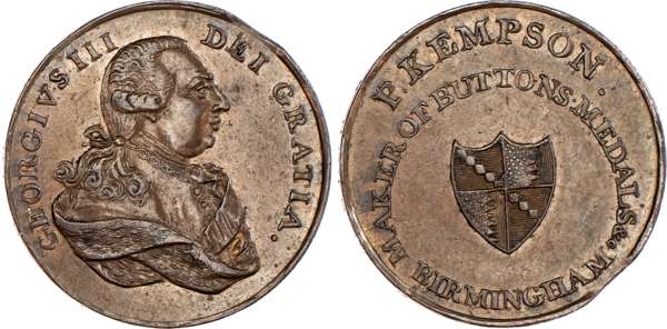 Birmingham, P Kempson advertising Halfpenny undated, Draped bust right of George III, rev. Arms of Birmingham and advertisement, edge plain 29mm/12.66gm. (DH 218). Another the same but with unrecorded edge SPENCE DEALER IN COINS LONDON, 29mm/12.58gm. (DH 218var), first good extremely Fine with golden iridescent lustre, second good Very Fine and toned – unrecorded edge and possibly unique. [2]