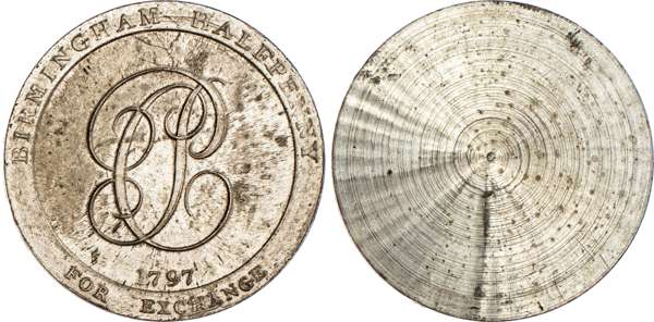 Birmingham, Charles Pye (engraver and token collector) uniface white-metal obverse die trial Halfpenny 1797, CP cypher, rev. blank (concentric rings), edge plain , 30mm/7.42gm. (DH 220), good Extremely Fine with some light surface spotting. Of the highest rarity, perhaps the only known specimen. Unique ?