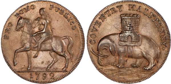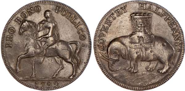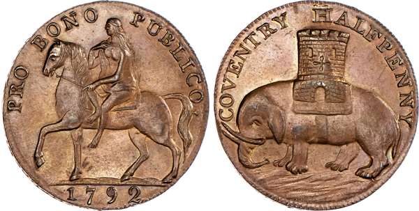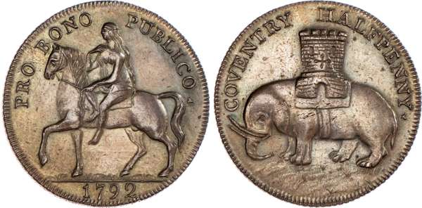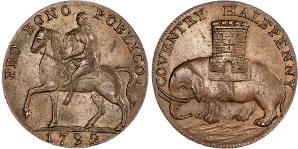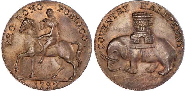 Coventry, Robert Reynolds & Co. (ribbon weaver and seller) Halfpenny 1792, Lady Godiva on horse, rev. Coventry arms – elephant and castle, edge PAYABLE AT THE WAREHOUSE OF ROBERT REYNOLDS & Co., 30mm/11.95gm. (DH 231). Another the same, 30mm/11.97gm. (DH 231). Another the same but edge milled, 31mm/12.54gm. (DH 231b), Another but unpublished edge – plain, 31mm/12.80gm. (DH 231c). Another similar but no period at end of rev. legend, 28.25mm/12.44gm. (DH 235). Another the same but plain edge,28.5mm/11.95gm. (DH 235b). Another similar but obv. legend smaller letters, 31mm/12.12gm. (DH 237), first two good Extremely Fine, both with some original colour and first with much reflection, DH 231 and 235 about Extremely Fine, DH 231c good Very Fine ‑ these three pieces with extremely rare edges ‘RRR’ remaining two Extremely fine or better, toned, rest scarce. [7]