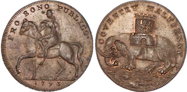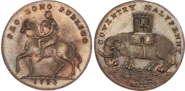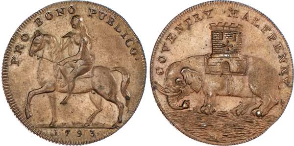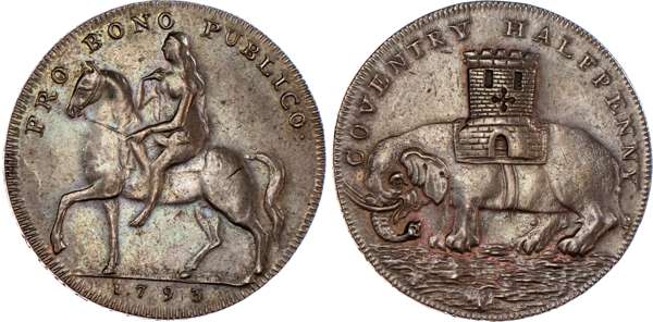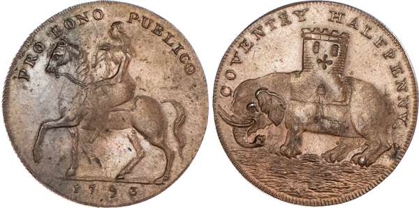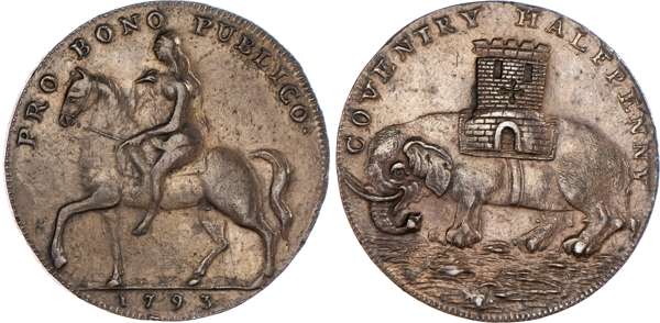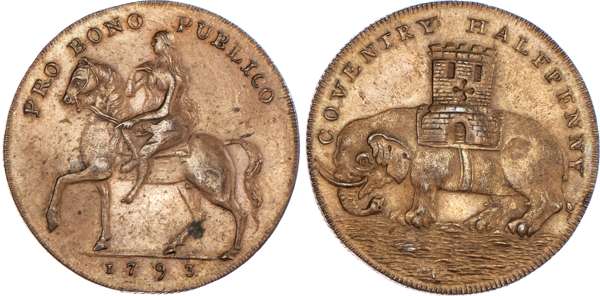 Coventry, Robert Reynolds & Co. contemporary copy of Halfpenny 1793, Lady Godiva on horse, rev. Coventry arms – elephant (different style) and castle, edge PAYABLE AT BIRMINGHAM LONDON OR BRISTOL, 30mm/9.99gm. (DH 238). Another the same but edge PAYABLE AT NUNEATON HINKLEY ///// OR ///BEDWORTH, 30mm/9.03gm. (DH 238b). Another the same but edge diagonally milled, 29.7mm/9.43gm. (DH 238e) Another the same but unpublished edge – plain, 29mm/10.14gm. (DH 238var). Another similar but legend spaced slightly differently and edge diagonally milled to right, 30mm/9.10gm. (DH 240). Another the same but edge diagonally milled to left, 30mm/9.98gm. (DH 240a). Another but further spacing differences and edge diagonally milled to right, 29.5mm/9.55gm. (DH 241c). Another the same but edge diagonally milled to left, 30mm/9.47gm. (DH 241d), all generally Extremely Fine for issue as a struck a little weakly, all toned except for DH 238b which is better struck and has traces of lustre, DH 238var extremely rare ‘RRR’, rest scarce. [8]