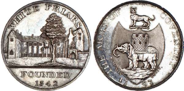 Coventry, P Kempson’s Series of Coventry Buildings, Silver proof Halfpenny 1797, White Friars steeple, rev. Arms and crest of Coventry, edge plain, 28mm/13.72gm. (DH 267a)), once wiped, otherwise good Extremely Fine, lightly toned with ‘blueish’ tinge’. Extremely rare ‘RRR’.