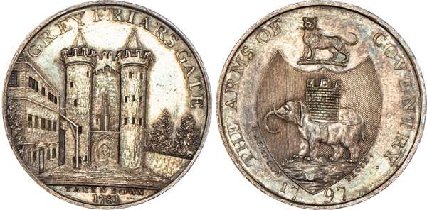Coventry, P Kempson’s Series of Coventry Buildings, Silver proof Halfpenny 1797, Grey Friars Gate, rev. Arms and crest of Coventry, edge COVENTRY TOKEN (faintly), 28.75mm/15.65gm. (DH 272), once wiped, otherwise good Extremely Fine, lightly toned with ‘blueish’ tinge’. Extremely rare ‘RRR’.