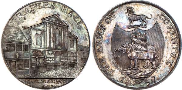 Coventry, P Kempson’s Series of Coventry Buildings, Silver proof Halfpenny 1797, Drapers’ Hall, rev. Arms and crest of Coventry, edge plain, 28.25mm/13.95gm. (DH 291var), once wiped, otherwise good Extremely Fine, lightly toned with ‘blueish’ and steel grey iridescence, small stains on obv. Extremely rare and apparently an unpublished edge ‘RRR+’.