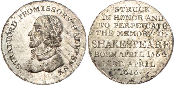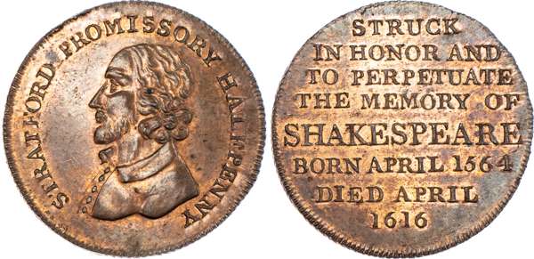 Stratford‑on‑Avon, Skidmore’s Halfpenny undated, Draped bust of Shakespeare left, rev. 8-line legend re. Shakespeare, edge diagonally milled, 31mm/11.74gm. (DH 320a). Another but in white metal and edge plain, 30.5mm/13.45gm. (DH 320b), both good Extremely Fine, first with almost full original lustre, second with good mint brilliance, both rare. [2]