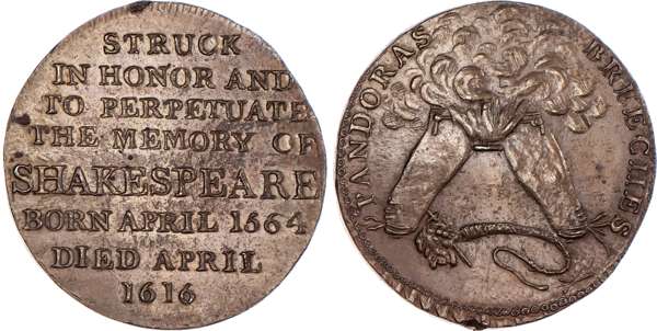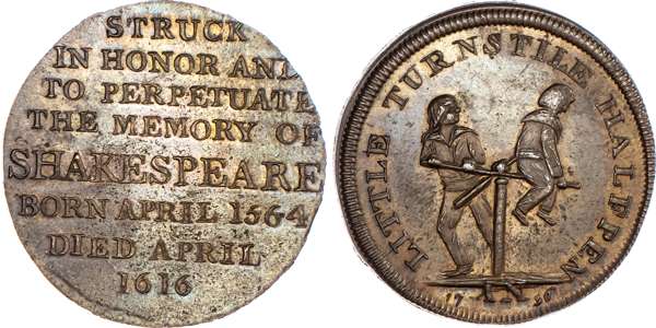 Stratford‑on‑Avon, Skidmore’s mule Halfpenny undated, Spence 9-line advertisement, rev. 8-line legend re. Shakespeare, edge plain, 28.5mm/10.17gm. (DH 324). Another mule with obv. Pandora’s breeches on fire, 30mm/10.87gm. (DH 325). Another mule but obv. two boys on a turnstile, 29mm/10.65gm. (DH 326), DH 325 has a small edge pinch ‑ otherwise all good Extremely Fine, and all toned, All rare[3].