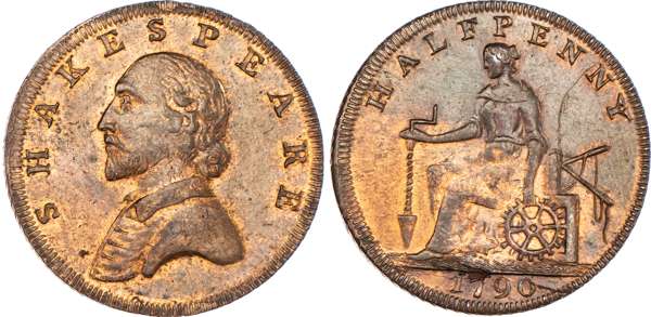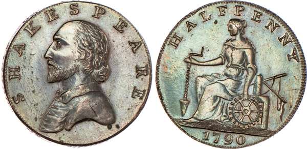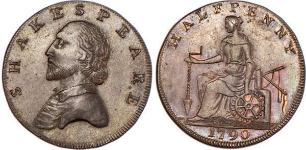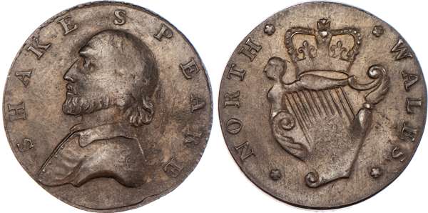 Stratford‑on‑Avon, General circulation Halfpenny 1790, Draped bust of Shakespeare left, rev. Commerce seated left, edge diagonally milled, 27.5mm/9.87gm. (DH 327a). Another the same but edge diagonally milled, 29mm/8.98gm. (DH 327d). Another the same but edge plain and rounded, 28mm/7.34gm. (DH 327f). Another mule but rev. Crowned Irish harp and legend ‘NORTH WALES’ and edge PAYABLE AT MACCLESFIELD LIVERPOOL OR CONGLETON .x., 27.75mm/8.56gm. (DH 330). Another the same but edge plain, 28mm/6.53gm. (DH 330a), first three good Extremely Fine, second with almost full lustre, remaining two good Very Fine. DH 330 very rare ‘RR’. [5]