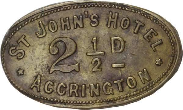 Lot of 4 coins - Lancs. Accrington, St. John’s Hotel, oval. uniface 2½d. 32x19mm. VF; Blackrod, Ridgway Arms, oct...
