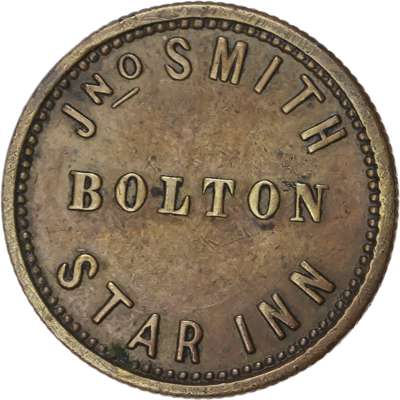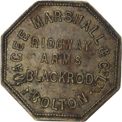 Lancs. Accrington, St. John’s Hotel, oval. uniface 2½d. 32x19mm. VF; Blackrod, Ridgway Arms, oct. uniface check 30.5mm. Magee Marshall & Co. Bolton, Star Inn, 2d., 22.5mm. Jno Smith. VF toned ( Bolton) , Bridgewater Arms , no denom 24mm. JS JR & Co. [4]