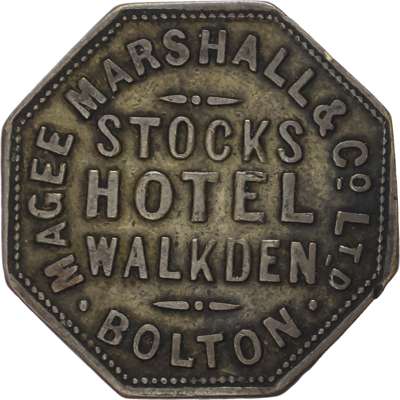 Lancs. Standish (Wigan), the Boars Head , no denom. uniface check, 22.5mm; 2d., 23.5mm. aVF, toned (2) ; Walkden (Manchester), Stocks Hotel octagonal 2d., 28mm. Magee Marshall & Co. Ltd. aVF, toned; White Lion & Railway Hotel , brass 2d. check 28mm. Good Very Fine ; Wigan, New Springs Top Lock Inn , 2d. check, 26mm. cm ‘R’ both sides.