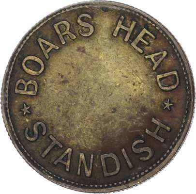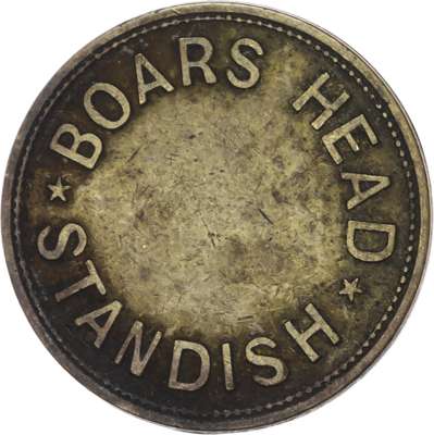 Lot of 5 coins - Lancs. Standish (Wigan), the Boars Head , no denom. uniface check, 22.5mm; 2d., 23.5mm. aVF, toned (2)...