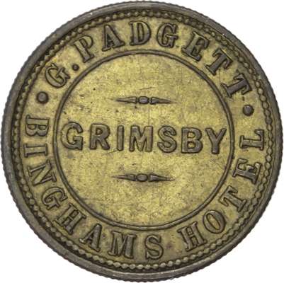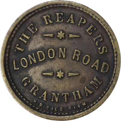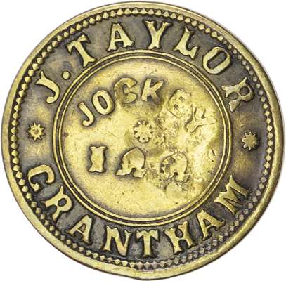 Lincs. Grantham, London Rd., The Reapers , 1½d., 26.5mm. (Sale). gVF; Jockey , 1½d., 2½d. (2 punched over the 1), 25mm. J Taylor, VF (2); Grimsby, Binghams Hotel , 3d., 26mm. G Padgett, Grimsby, Freeman St., Red Lion Hotel , 2d., 26.5mm. gVF. [5]