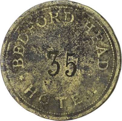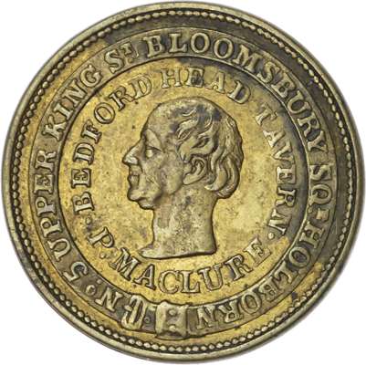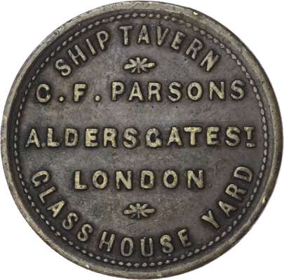 Lon. Barbican, Aldersgate St. Ship Tavern , 3d, 27mm. G F Parsons, VF, toned; Bermondsey, Upper Grange Rd. off Old Kent Road. Greyhound , 1½d. 29mm. Walter W Tyler, stamped ‘P’ cm both sides. VF; (Bloomsbury), Bedford Head , 2d, 32mm. punched 35. (Spink) , no denom., 24mm. P Maclure E Bloomsbury, Dyott St. Two Brewers , 2d.., 28mm. Pocock’s VF, toned. [5]