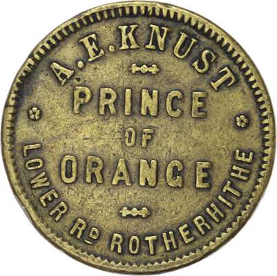 Lot of 5 coins - Lon. (Rotherhithe), Anchor Tap , 2½d. 36mm. (Percival) VF; Lower Rd. Prince of Orange, 4d. A E Knust...