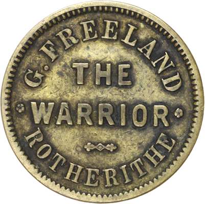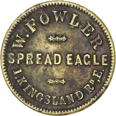 Lon. (Rotherhithe), Anchor Tap , 2½d. 36mm. (Percival) VF; Lower Rd. Prince of Orange, 4d. A E Knust (Taylor). aVF; Rotherhithe, Warrior , 6d. 28mm. Shoreditch, City Rd. Eagle Tavern , wm 6d. 35mm. T Rouse, aVF, pierced; Shoreditch, Kingsland Rd. Spread Eagle , 3d. 28mm. W Fowler, (Taylor) , VF. [5]