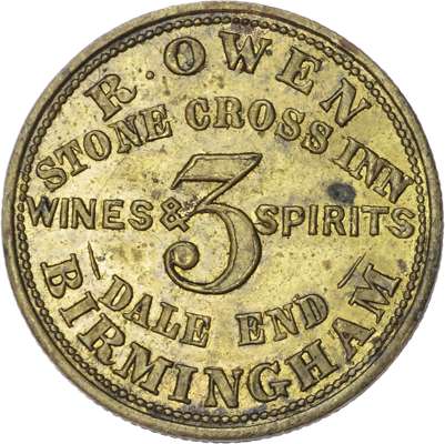 West Mids. Birmingham , Dale End. Old Engine 3d. 25mm. J Janion, gVF; Star Inn wm 3d. 28mm. John Sheldon Jnr. Stone Cross Inn uniface 3d. 27mm. R Owen, EF; Star Spirit Vaults 2½d.26mm. R Pennell (Smith) , VF; Deritend, Alcester St. Dog Inn . 3d. 23.5mm. Chas. Evans, (Sale) VF [5]