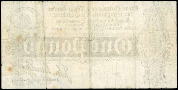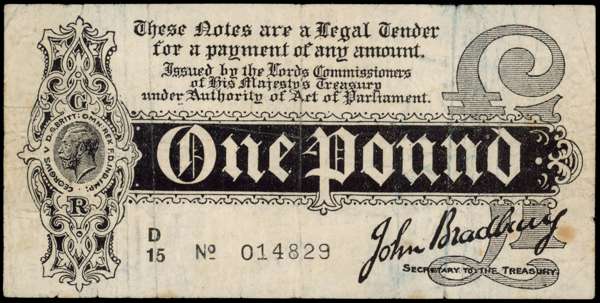 Treasury, J. Bradbury, (first issue), One Pound, Aug. 1914, D/15 014829, (Dugg. T5-3b). Several pinholes, smal…