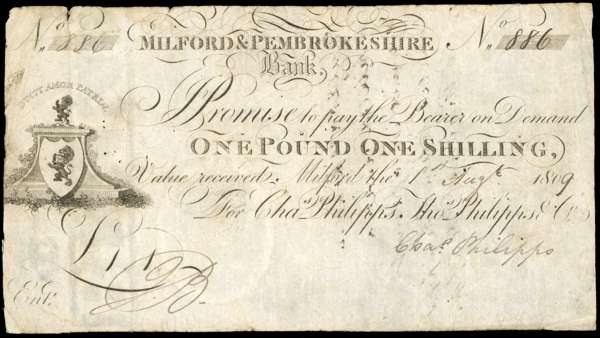 MILFORD, Milford & Pembrokeshire Bank, for Chas. Phillipps, Thos. Phillipps & Co., Guinea, 1 August 1809, serial number 886, signed Chas. Philipps, arms to l., (Outing 1431). Pinholes and slightly trimmed – otherwise, Fine, ink bankruptcy details on rev.