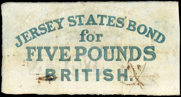 JERSEY, States of the Island of Jersey, £5.,(interest bearing), 1 September 1840, Serial number 200, Arms of Jersey above, three cancelled manuscript signatures at left, reverse JERSEY STATES’ BOND FOR FIVE POUNDS BRITISH. (Pick A1b). Extremely Fine. Cheques