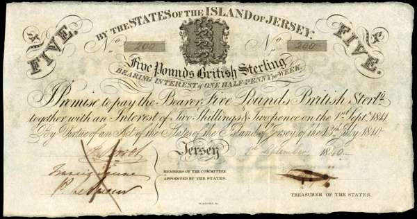 JERSEY, States of the Island of Jersey, £5.,(interest bearing), 1 September 1840, Serial number 200, Arms of J…