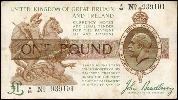 Treasury, Third Issue, J. Bradbury, One Pound, 1917-19, A/94 939101, (Dugg. T16). About Fine, large pin hole in centre.