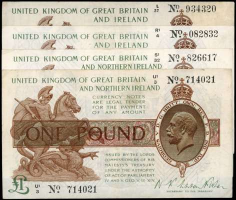 Treasury, N F Warren-Fisher, (first issue), One Pound, Sept. 1919, L/37 934320; R/93 626786; S1/32 826617; U1/…
