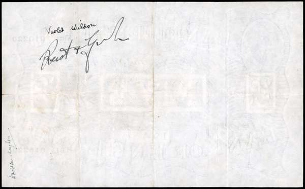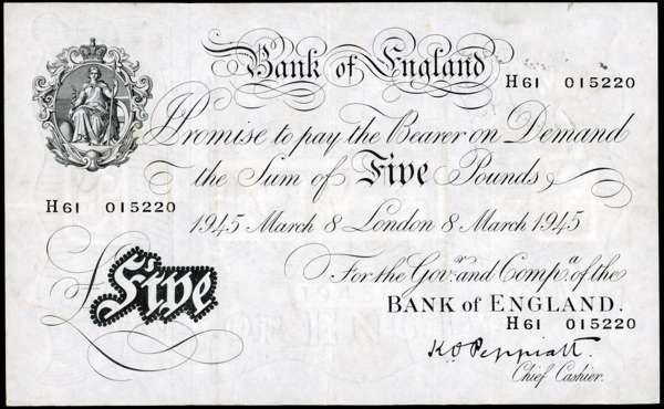 Bank of England, K O Peppiatt, White Five Pounds, London, 8 Mar. 1945, H/61 015220, (Dugg. B255). About Very Fine, traces of folds, inked name on rev.