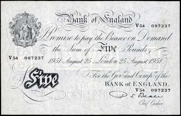 Bank of England, P S Beale, White Five Pounds, London, 25 Aug. 1951, V54 097237, (Dugg. B270). About Very Fine, slight traces of folds.