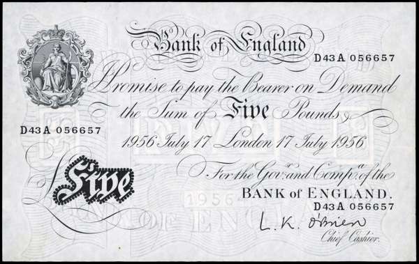 Bank of England, L K O’Brien, White Five Pounds, London, 17 Jul. 1956, D43A 056657, (Dugg. B276). Good Very Fine.