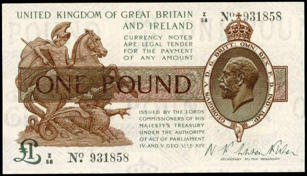 Treasury, N F Warren-Fisher, (first issue), One Pound, Sept. 1919, Z/58 931858, (Dugg. T24). Extremely Fine.