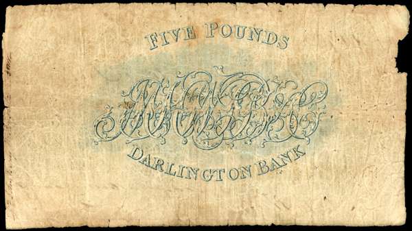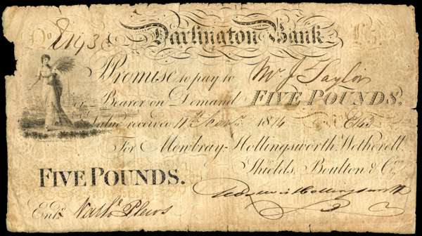 DARLINGTON, Darlington Bank, for Mowbray, Hollingsworth, Wetherall, Shields & Bolton £5.,11 Nov 1814, signed G L Hollingsworth, no. E143. Vignette of Plenty to left. (Outing 630d). About Fine, small piece missing left-hand side– rare.