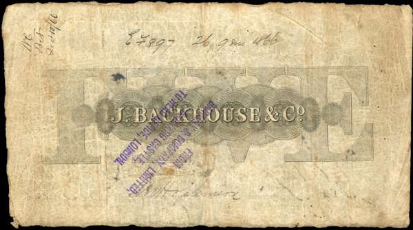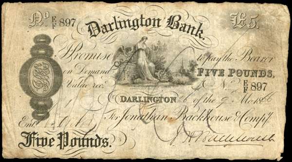 DARLINGTON, Darlington Bank for Jonathan Backhouse & Co., £5.,1866, signed J E Backhouse, serial no. E/F 897. Standing woman vignette to centre. Cancelled in black ink crossing out, dated on the back 1866 with other annotations and a bleu Barclay Bank, Barnard Castle stamp. (Outing 629q). Good Fine.