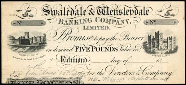 HAWES, Swaledale & Wensleydale Banking Company Limited, PROOF £5.,(1883) no signatures or serial numbers, vign…